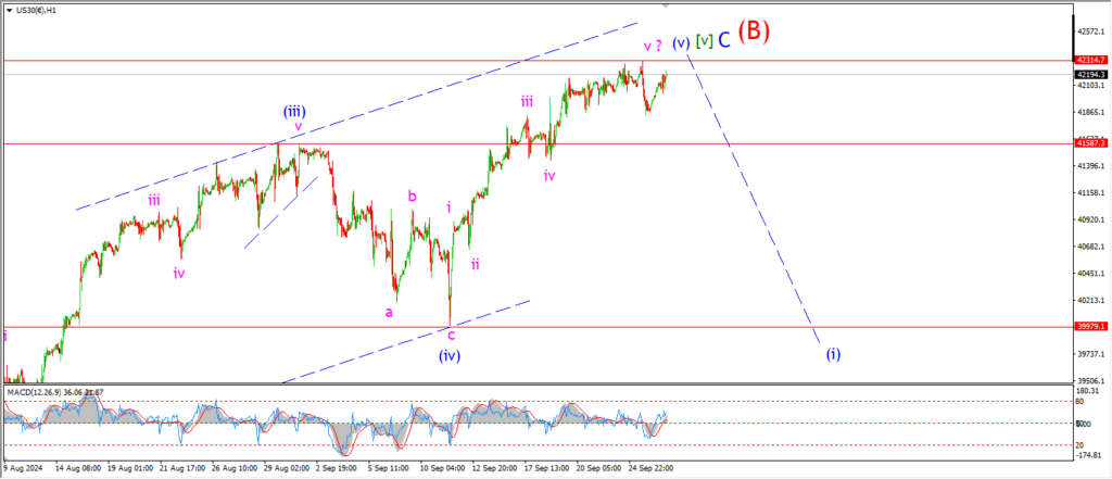 Watch for wave (v) to top out and confirm a turn with a drop back below 41580.