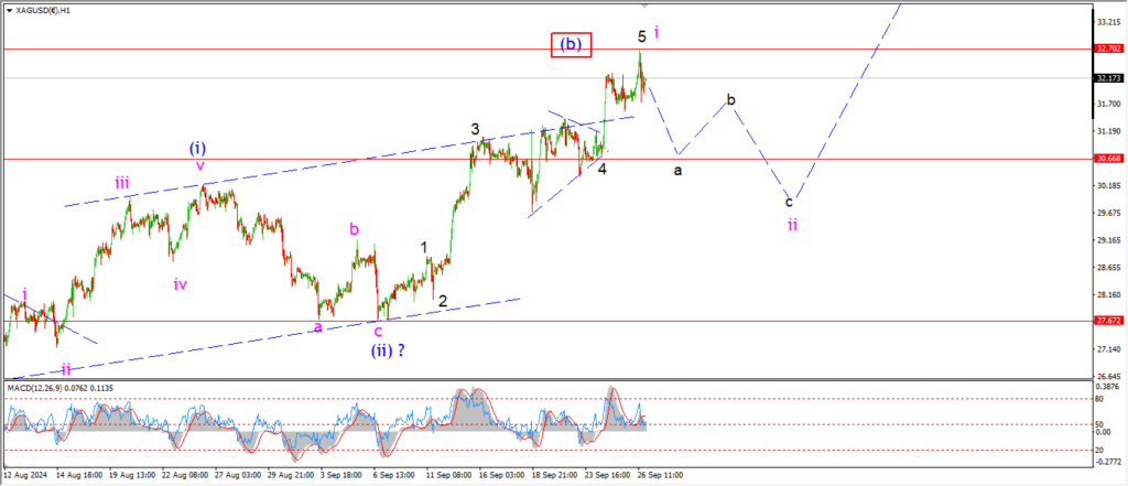 Silver managed to push higher to complete a five wave rally in wave ‘5’ black today.