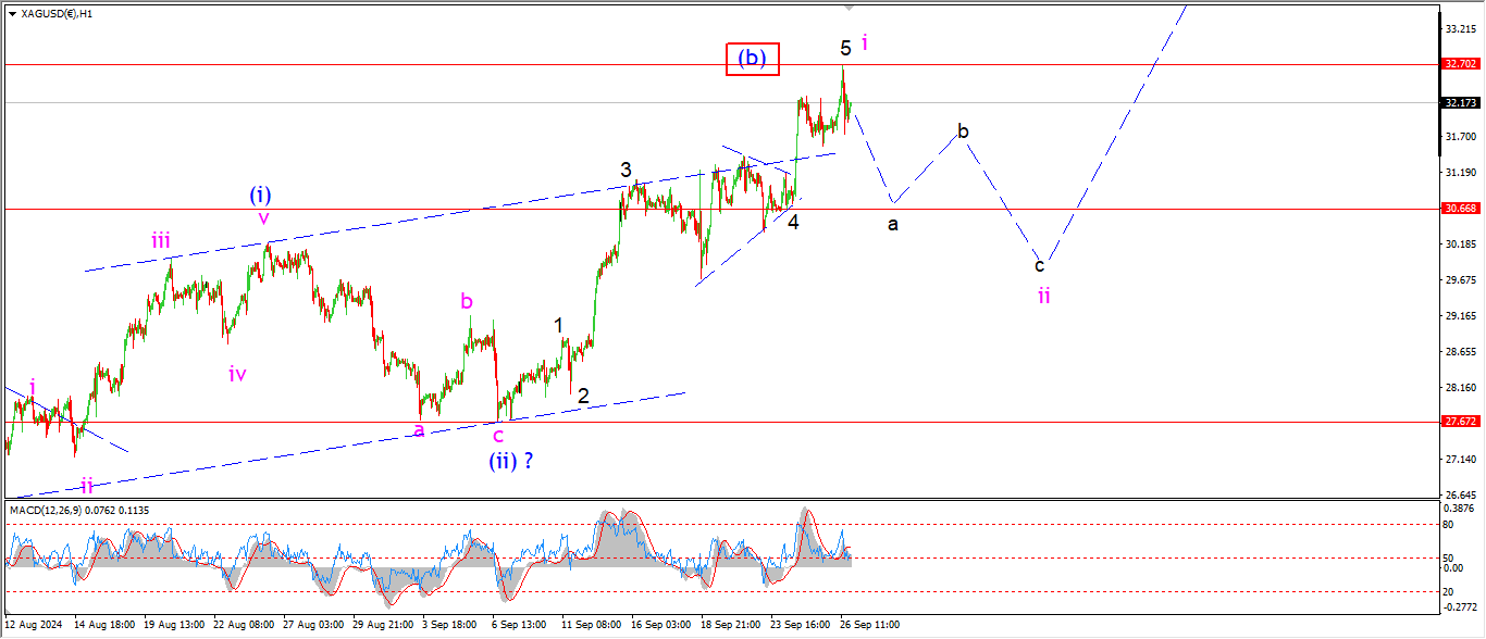 Silver managed to push higher to complete a five wave rally in wave ‘5’ black today.