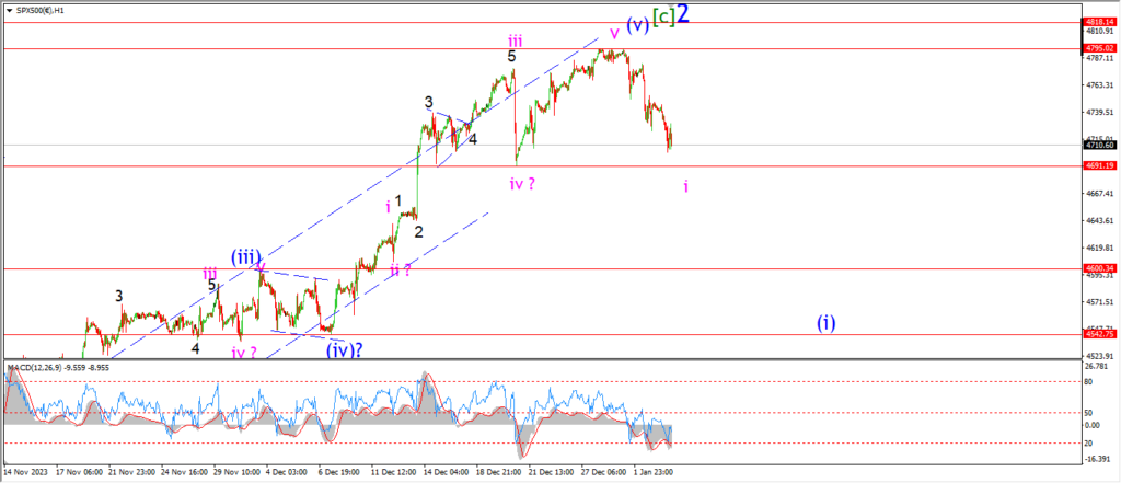 Watch for wave ‘i’ to break support at 4690 as the first step to a much bigger decline phase.