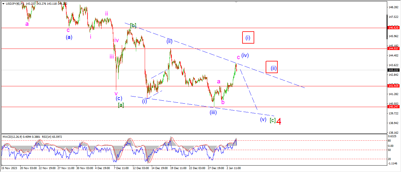 USDJPY has completed three waves up in wave (iv) now and wave ‘c’ has extended a little higher today as suggested.
