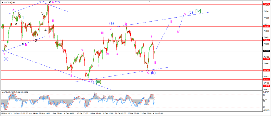 I would like to see a break of the wave ‘i’ high at 74.04 tomorrow to signal wave ‘iii’ is in play.