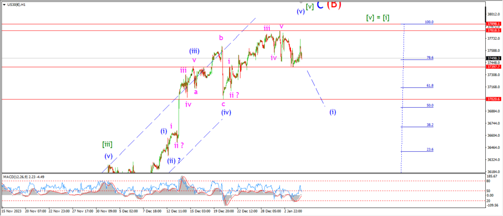 Watch for a break of 37400 tomorrow for a hint that wave (i) is in play.