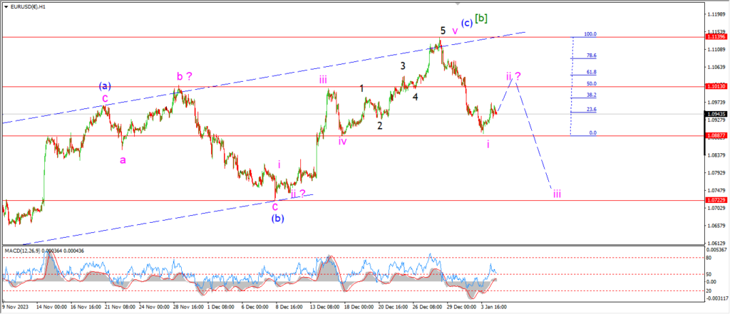 Although the price has not broken the wave ‘iv’ support at 1.0887 I am going to go with the idea that this decline is wave ‘i’ of (i) of [c].