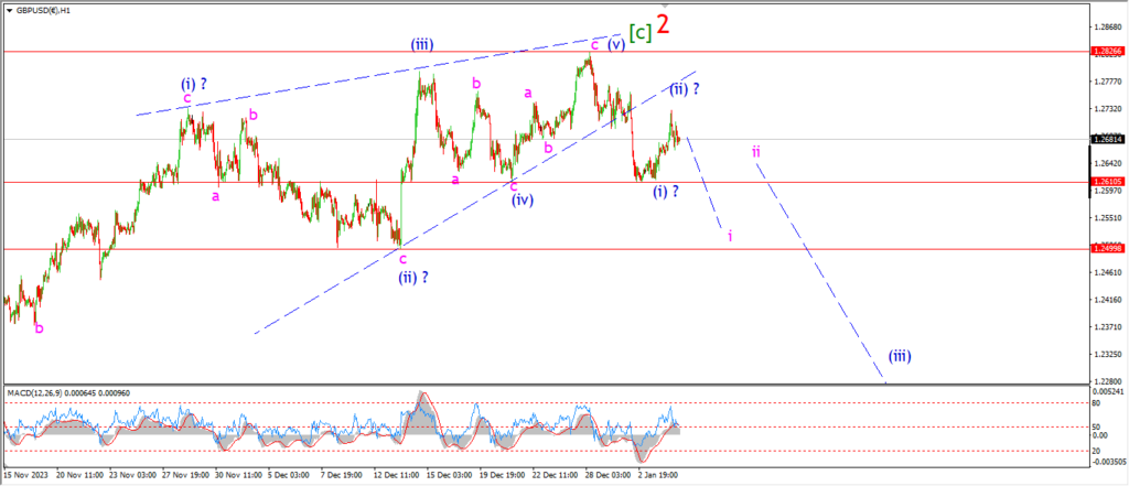 Watch for wave ‘i’ of (iii) to turn lower and break 1.2610 again.