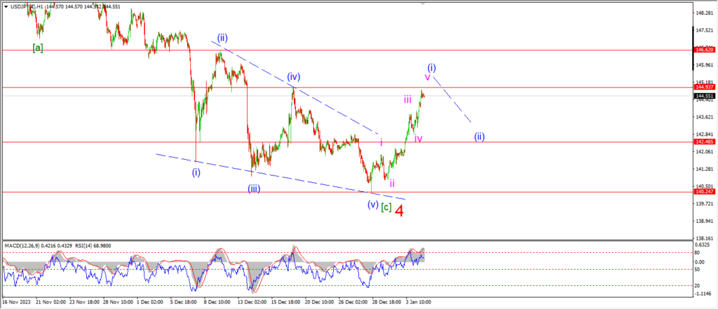 and this should be followed by a three wave correction in wave (ii) towards 142.50 again over the coming few sessions.