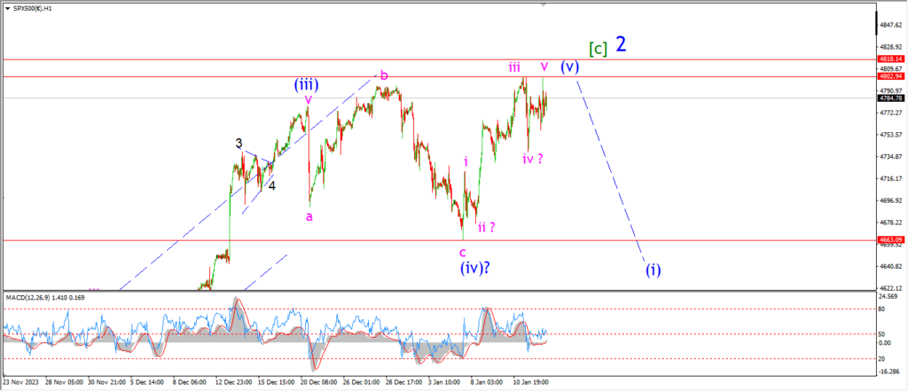 Watch for wave (i) to finally kick in and drop the market back below the wave (iv) lows at 4660.