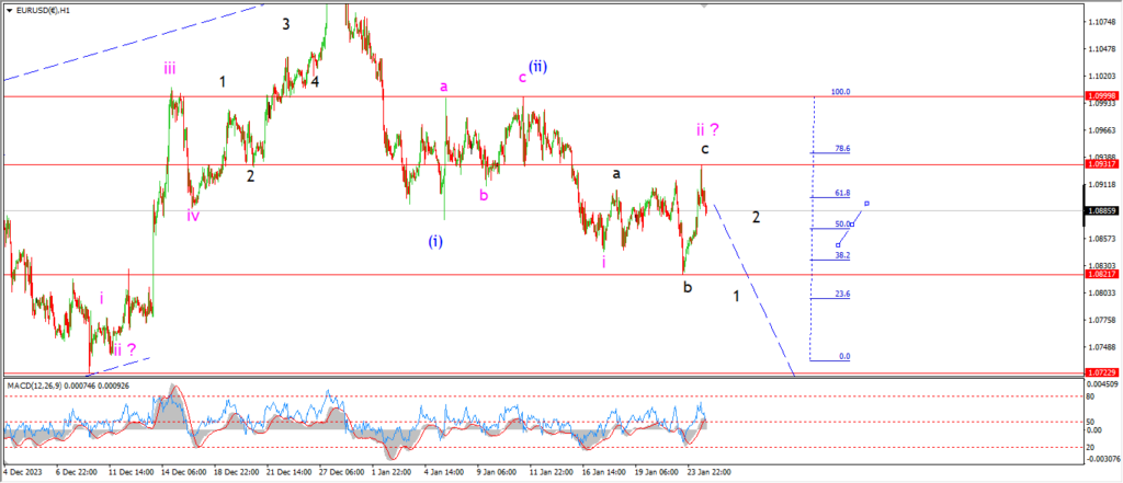 Watch for wave ‘iii’ of (iii) to turn lower and break the wave ‘b’ low at 1.0822.