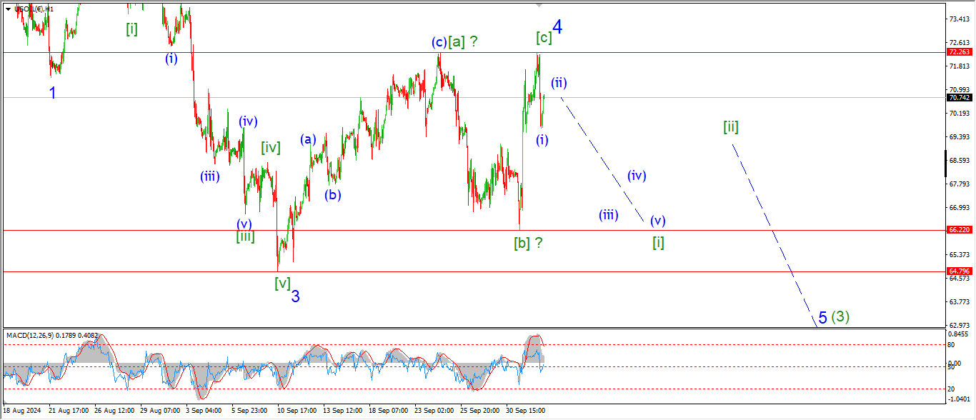 Watch for wave (iii) to fall back into the 68.00 level to signal that wave [i] is underway.