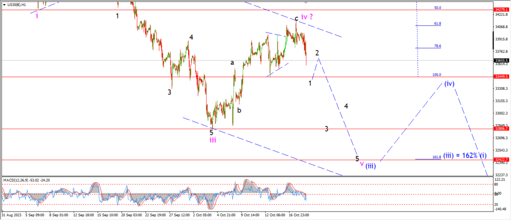 Watch for wave ‘iv’ to hold and wave ‘1’ of ‘v’ to fall back below 33450 again to signal the pattern in wave ‘v’ is underway.