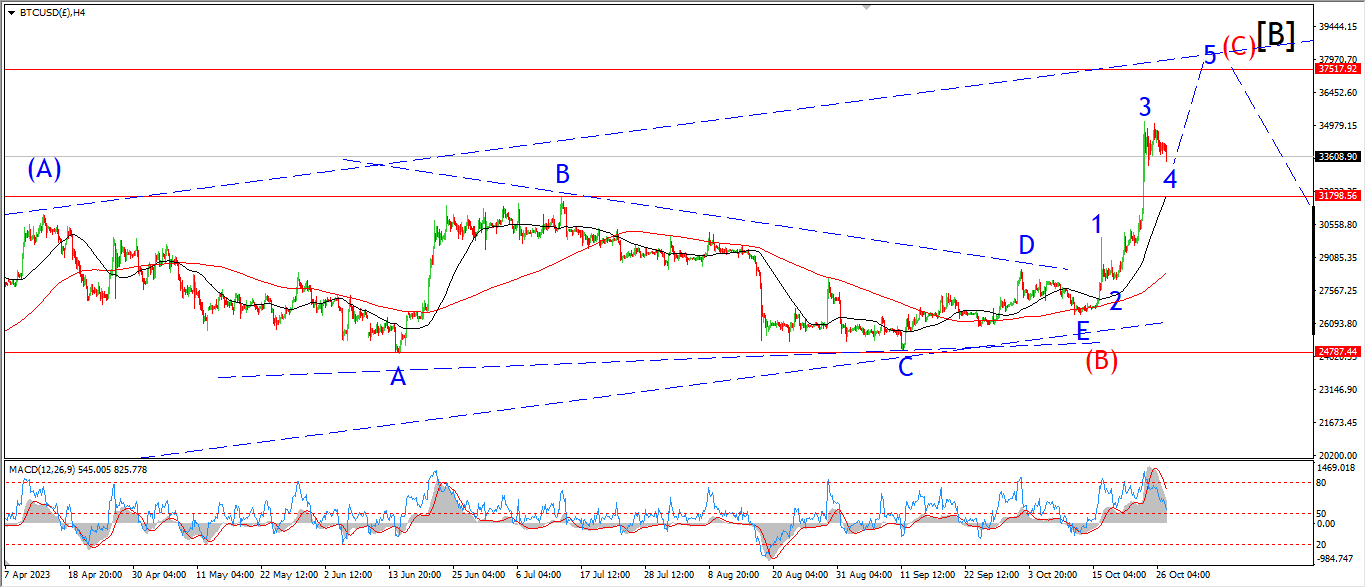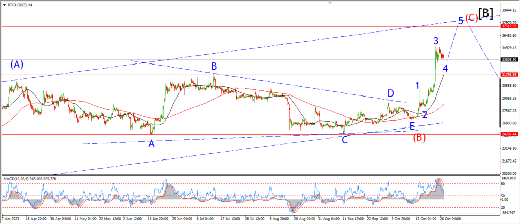 The most important level from here on as wave (iv) develops is that wave (i) low at 34020.