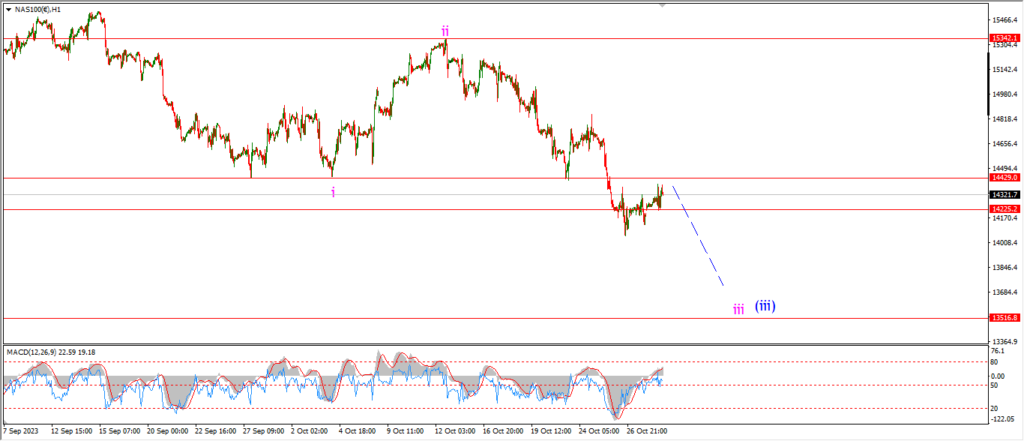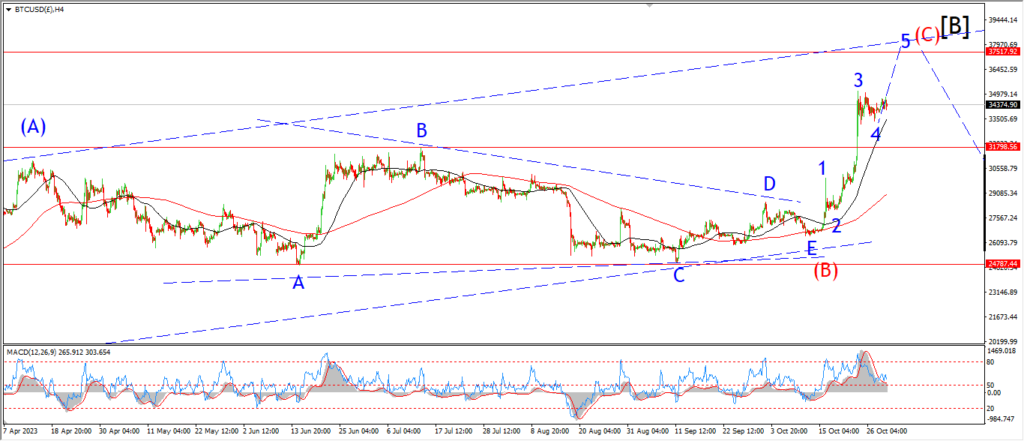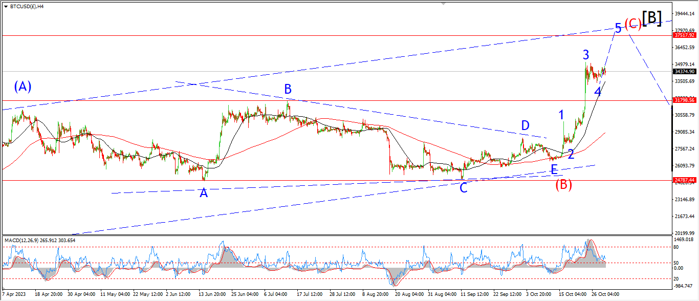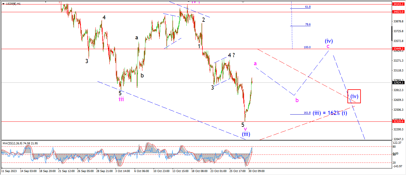 Wave ‘b’ should correct lower towards the 32600 area and hold above the wave (iii) low.