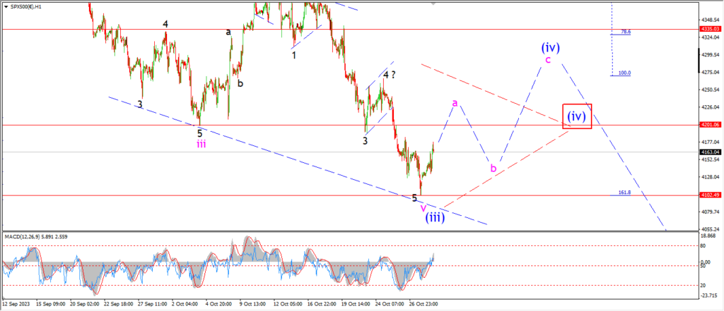 Watch for wave ‘a’ of (iv) to continue higher in three waves to hit the 4200 area.