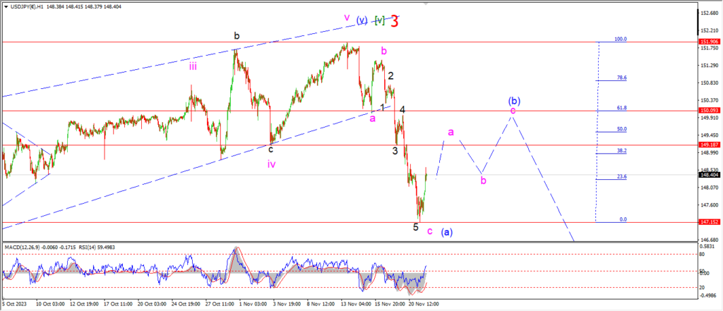 The overnight trade brought another spike lower into wave (a) with the low reaching 147.15 again.