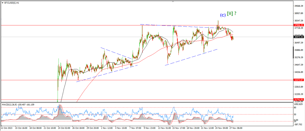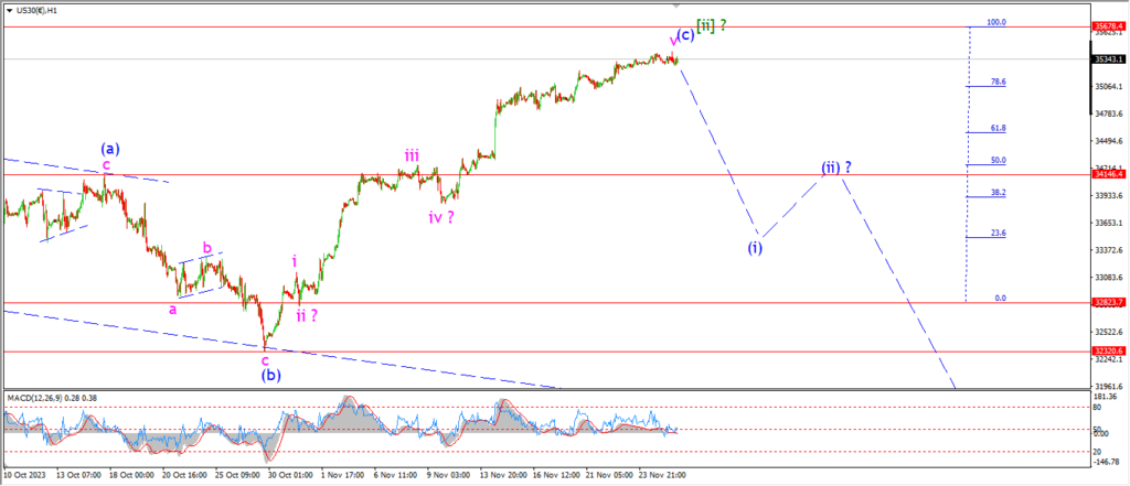 Watch for wave (c) of [ii] to hold below the wave ‘2’ high at 35678.