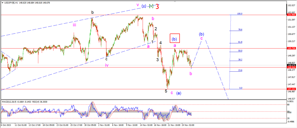 Watch for wave ‘b’ to complete soon and then wave ‘c’ of (b) to turn higher again to complete three waves up above 149.76.