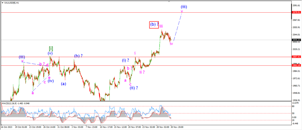 Wave ‘v’ of (iii) must turn higher again and hit with an expected high in the area of 2080 again.