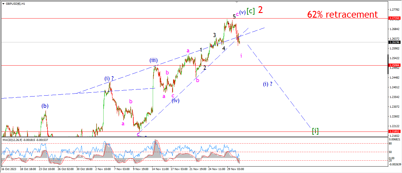 Watch for wave ‘i’ to complete below the rising wedge trendlines with a break of 1.2600 again.